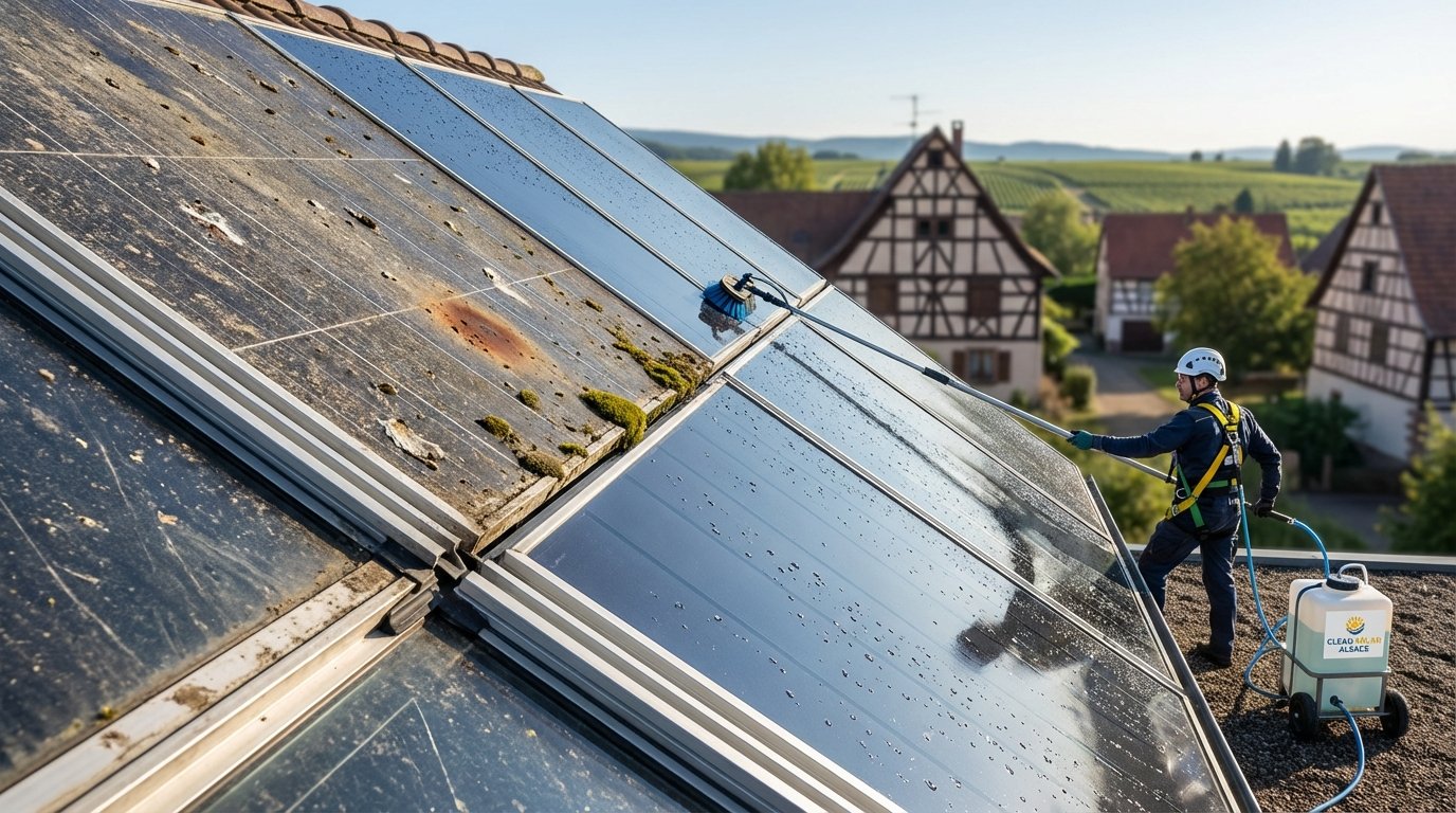 L’erreur classique : penser que la pluie suffit à nettoyer les panneaux. En réalité, l’eau de pluie déplace la saleté sans l’éliminer, créant des accumulations en bas des modules. Et en Alsace, avec notre climat continental, les périodes sèches peuvent durer plusieurs semaines, laissant le temps aux dépôts de s’incruster.